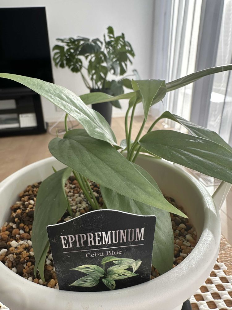 エピプレムナム•セブブルーがレース越しに自然光を浴びている。その奥には、モンステラ•アダンソニー がある。そんなリビングで、私は寛ぐ。