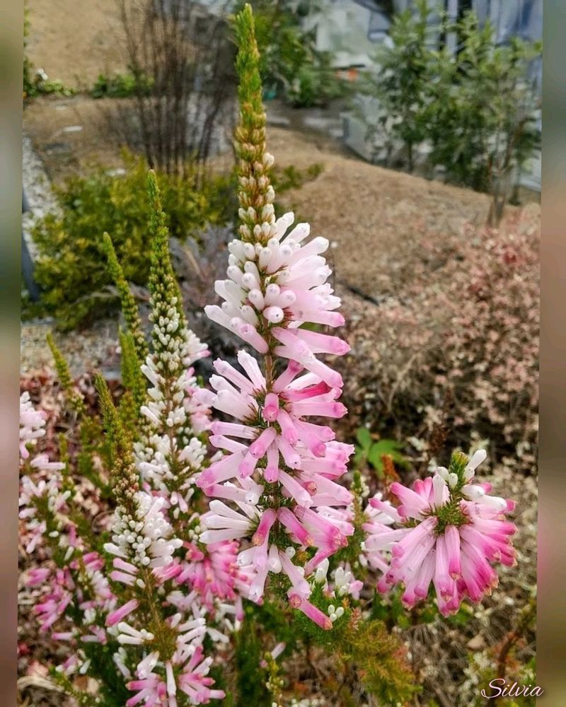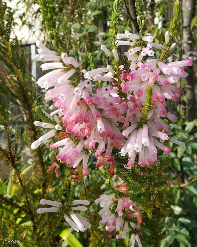 ♣️エリカ・クリスマスパレード(Erica Christmas Parade)は、 エリカ・ヒエマリス(学名:Erica.× hiemalis)の園芸品種で、 長い筒型をした薄紅色の花を茎の廻りに輪状に茎の基部から先端まで多数咲かせる ツツジ科エリカ属の半耐寒性常緑低木。♣️