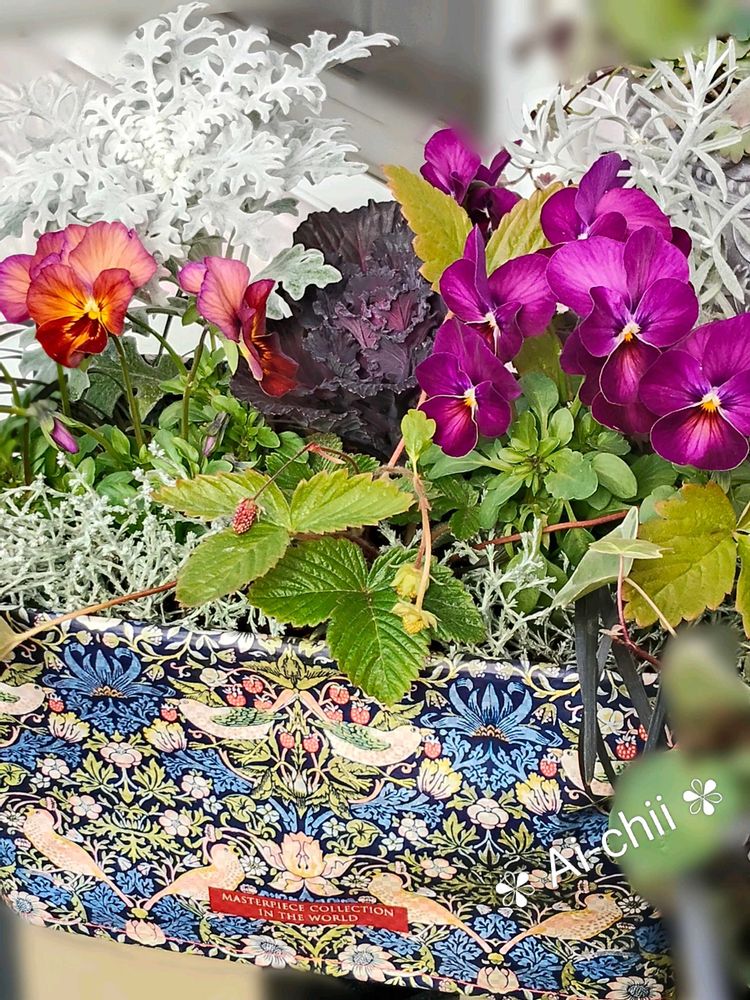 シルバーリーフがしっかり見えることで、寄せ植えの色合いといちご泥棒の鉢の色とのバランスがより良くなって、鉢込み全体を意識して作られたことがよく分かります✨💞
