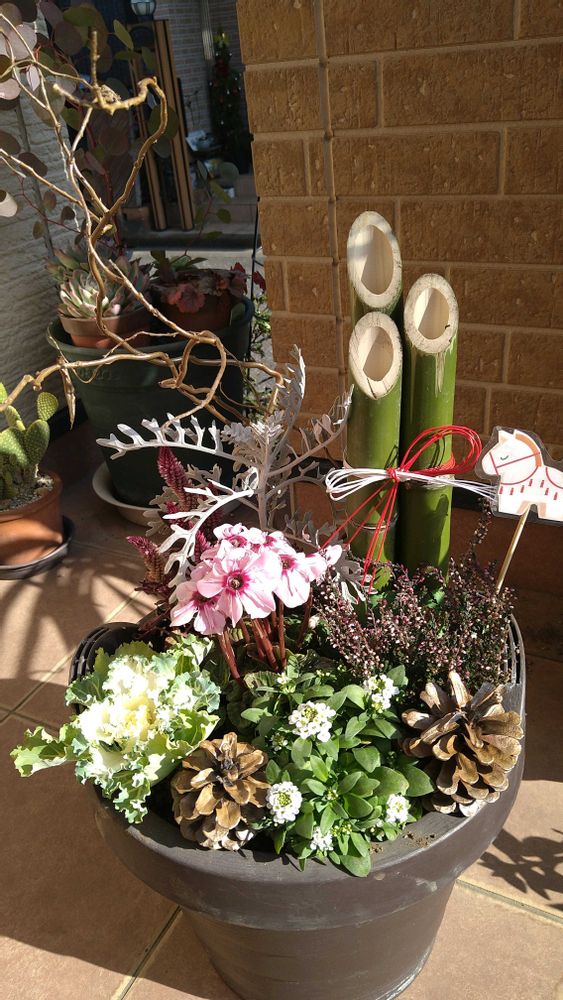 今年は雲龍柳や松ぼっくりを金のスプレーして、ピックも手作りしました😊