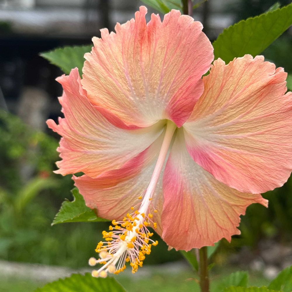 面倒な書類仕事であっち行ったりこっち行ったりする合間に見つけたサーモンピンクのハイビスカス。ああ、キレイ。癒されます。🧡