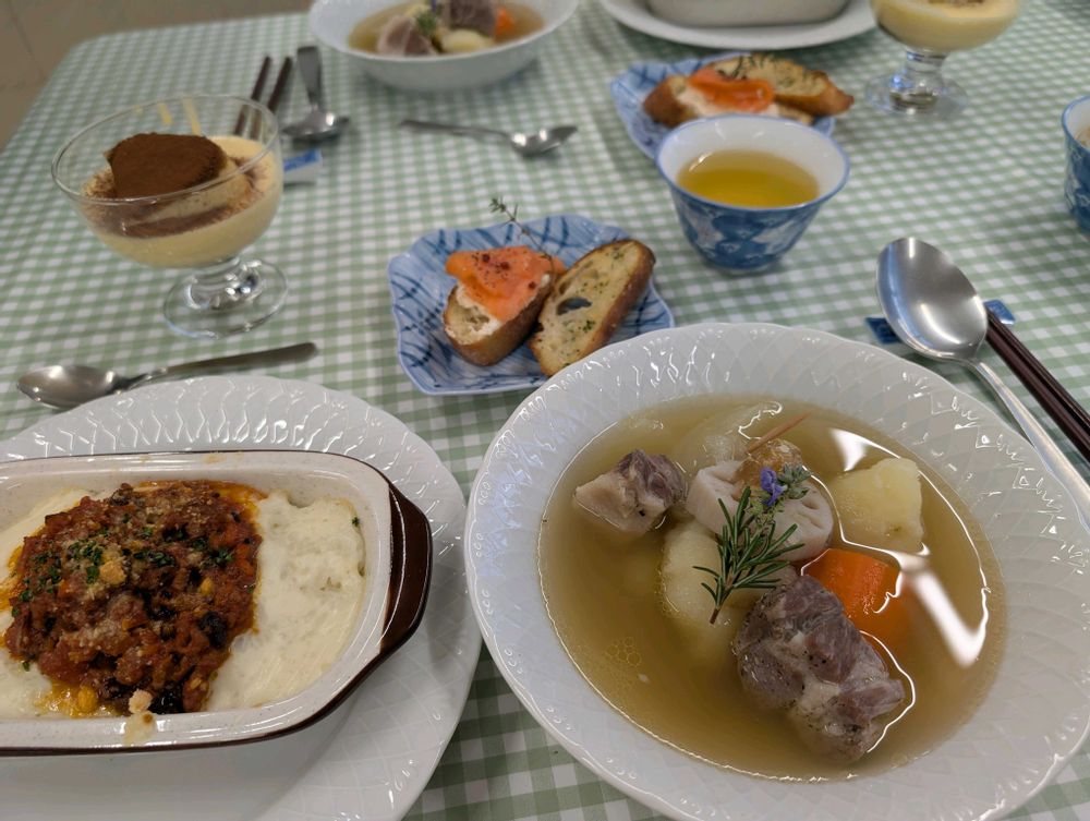 華やかで美味しく楽しむ🧑🍳Xmas🌿を受講しましたψ(´ڡ`♡) オイシー♪「サーモンのブルスケッタ」「ポトフ」「ミートドリア「簡単ティラミス」自家製のハーブ🌿🎄*ᕷ˖°🐣✩⃛ೄ🎁🧦* ੈ✩🐣*ᕷ˖°🎄