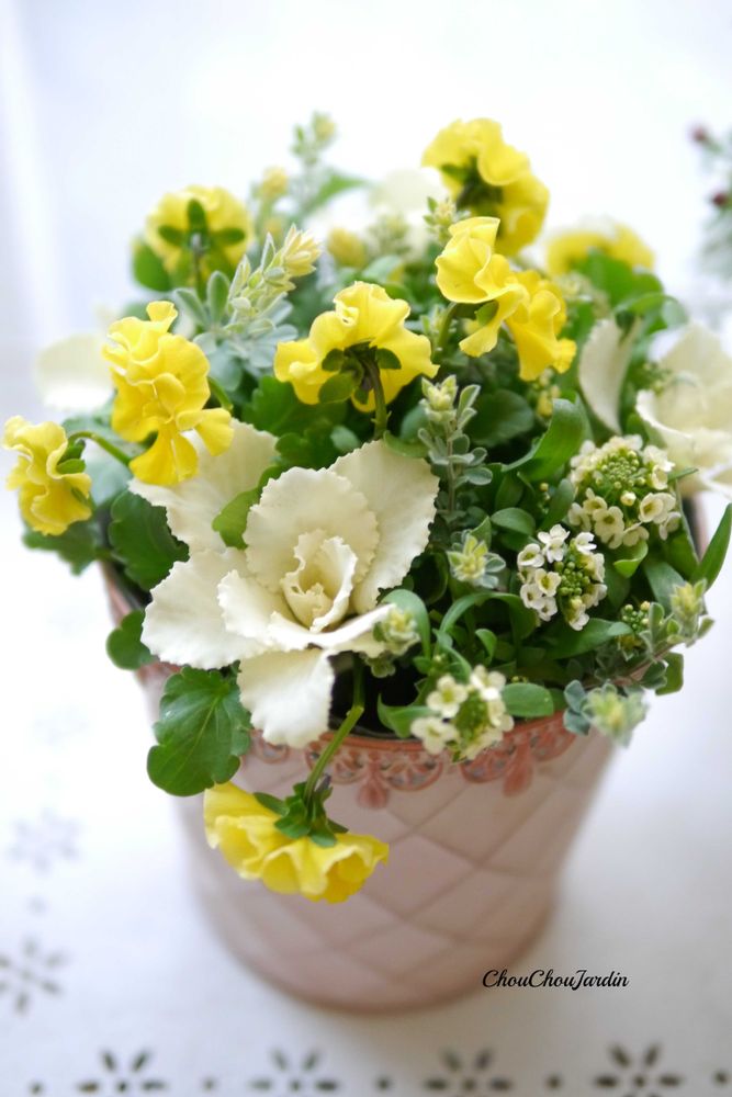 ビタミンカラーのオーダーだったので、はっきりした黄色と淡い黄色で全体的に統一感のある寄せ植えにしました。