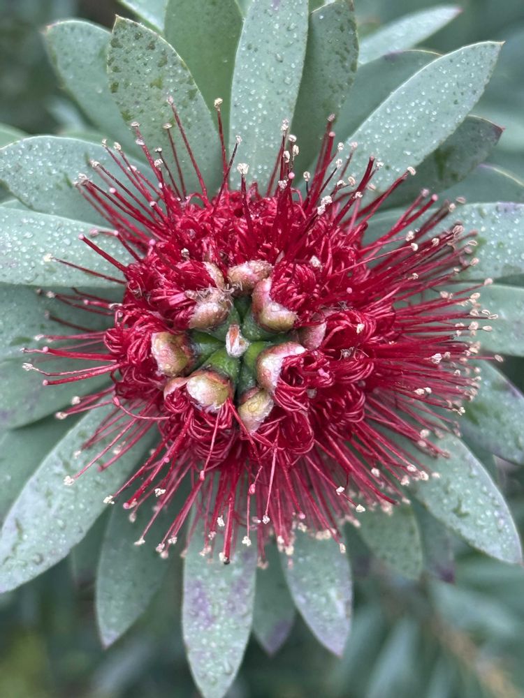 Callistemon citrinus/Callistemon. Myrtaceae. Myrtales. Magnoliopsida. Tracheophyta Commonly called/Crimson Bottlebrush. Red Bottlebrush Native to/Eastern Australia Symbolism/Vitality. New beginnings *Genus of 25 species and evergreen trees and shrubs *Features brush-like red flower spikes and leaves that release a lemon scent when crushed. *Large-shaped, dark green leaves to 4in(10cm)long. Brilliant red flowers in spikes, 2-6in(5-15cm)long. *Callistemon comes from two Greek words. ‘kalli’ meaning “beautiful” ‘stemon’ meaning “stamens”(oshibe) Photographed 12/18 10:14am 2025 Posted 12/19(Friday) 12:27pm 2025