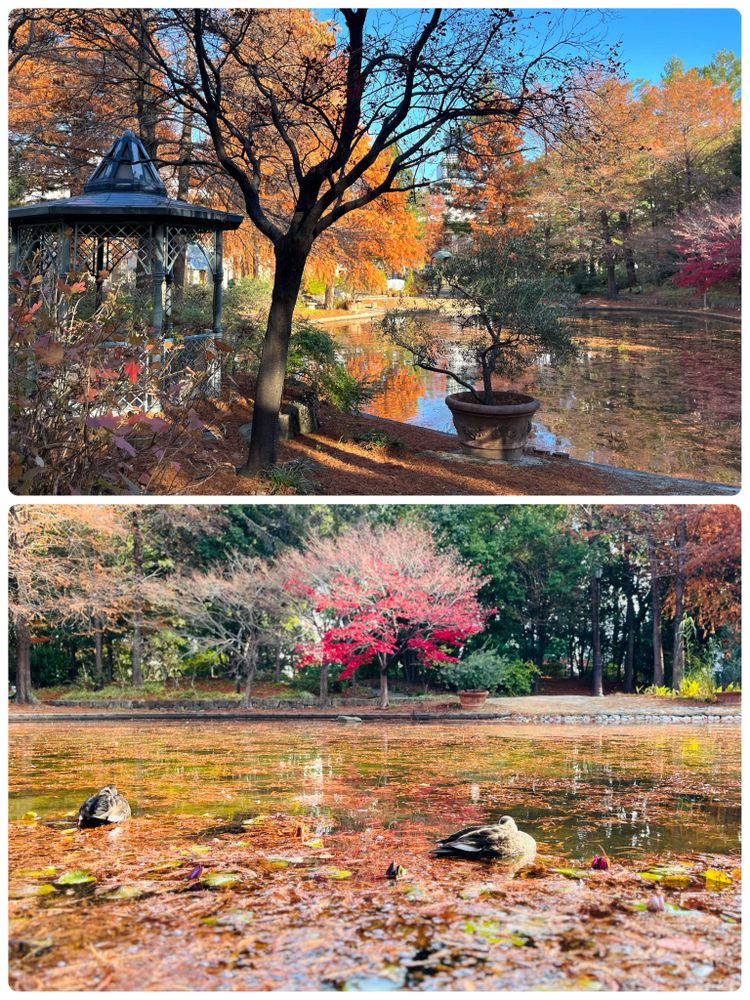 落葉🍂の敷き詰められた池の鴨さん🦆、周りの紅葉🍁の景色がとっても素敵ですね💓💓💓