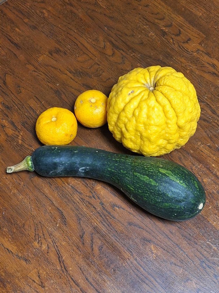 ③ご近所さんから冬至用にいただいた、シシユズと鶴首カボチャと、わが家の庭でなったユズ😄