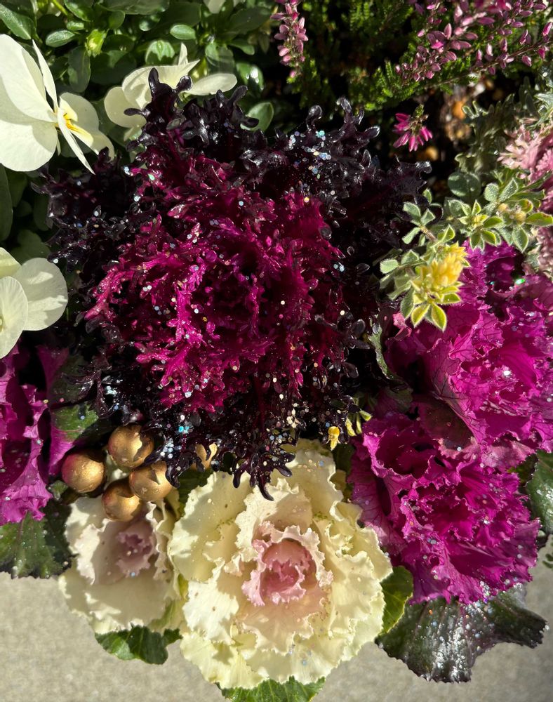 ビオラがモリモリ咲いてました!お店でみたキラキラ葉牡丹が可愛くて、我が家の葉牡丹に100均のラメグリッターをふってキラキラにしてみました😆