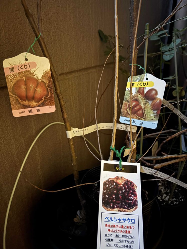 4枚目は、前回購入した栗苗、銀寄せの相棒として昨日買ってきた筑波の苗とYouTube見てたら欲しくなった柘榴のペルシャブラックの苗木。