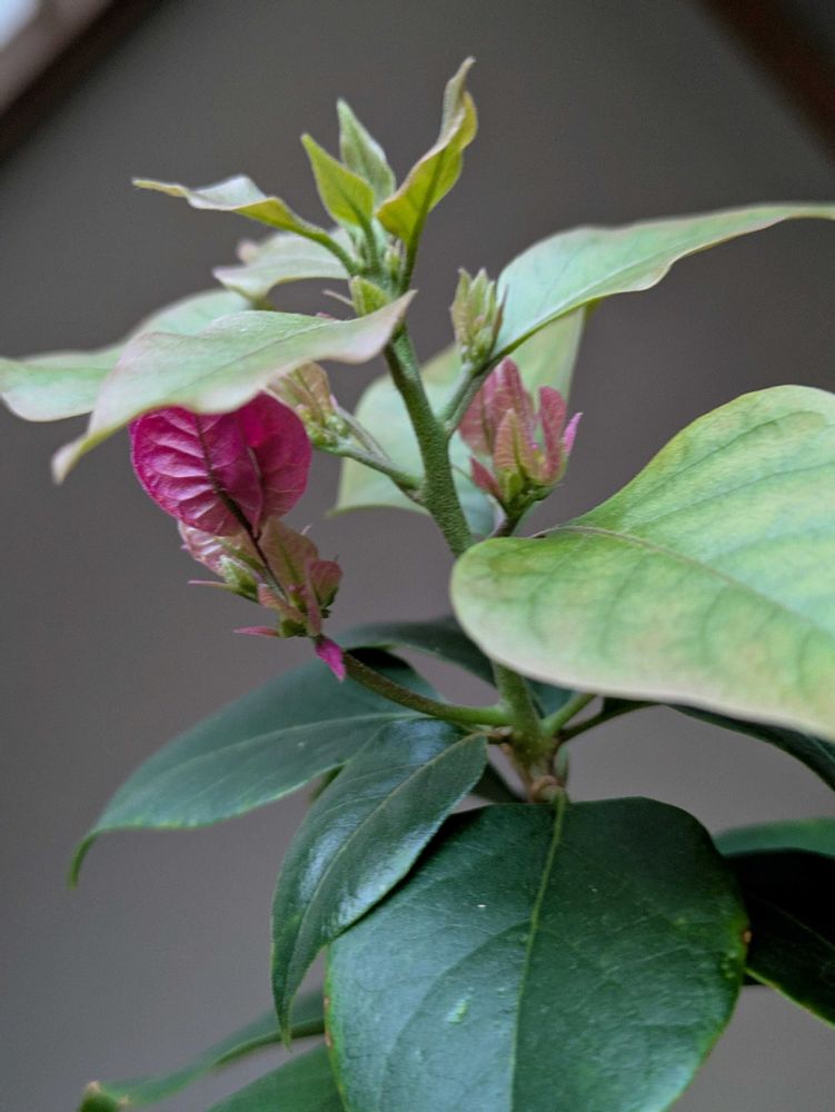 ブーゲンビリアはお部屋の中の日当たりのいい場所だからなのかピンク色💗が見え始めました💦