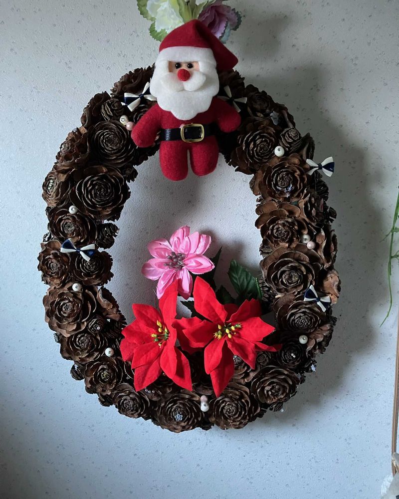 前に作ったリースに造花のポインセチアとサンタのおじさん🎅を付けてみました🤭