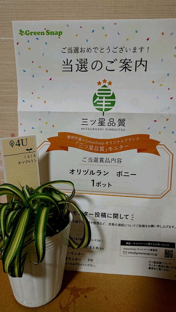 豊明市場×GreenSnapオリジナルブランド「三ツ星品質」モニターオリヅルラン ボニーが当選しました✌️
