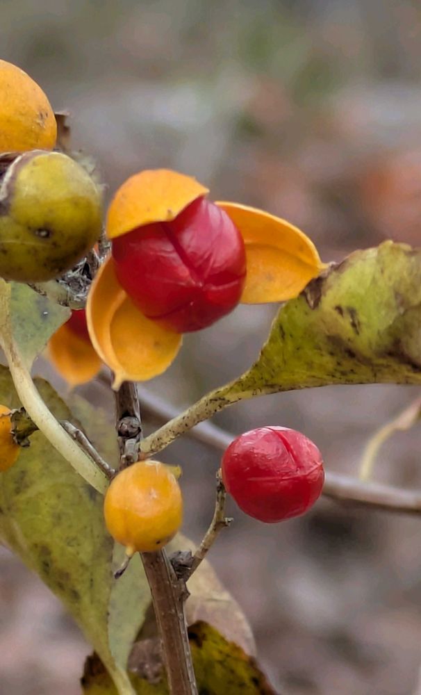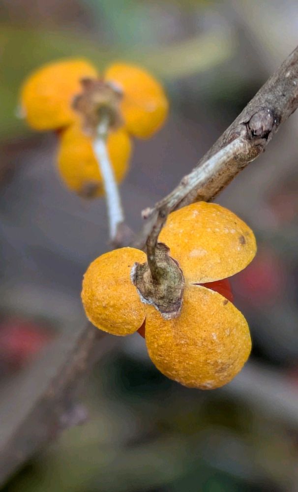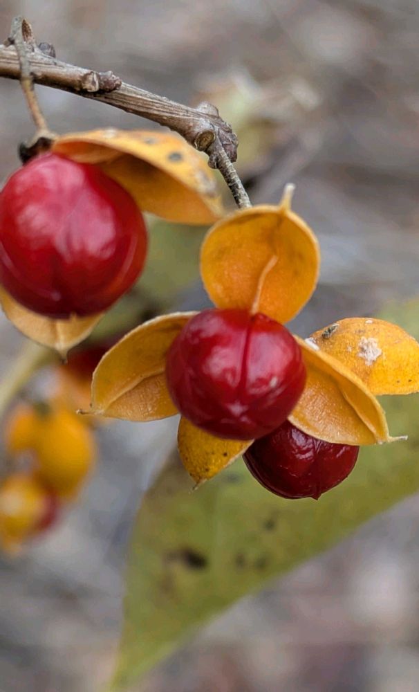 堅い殻が3裂して、赤い仮種皮に包まれた実が鮮やかな 日曜ビタミンカラー♪🏷中には種が3つ入っているらしい🔴