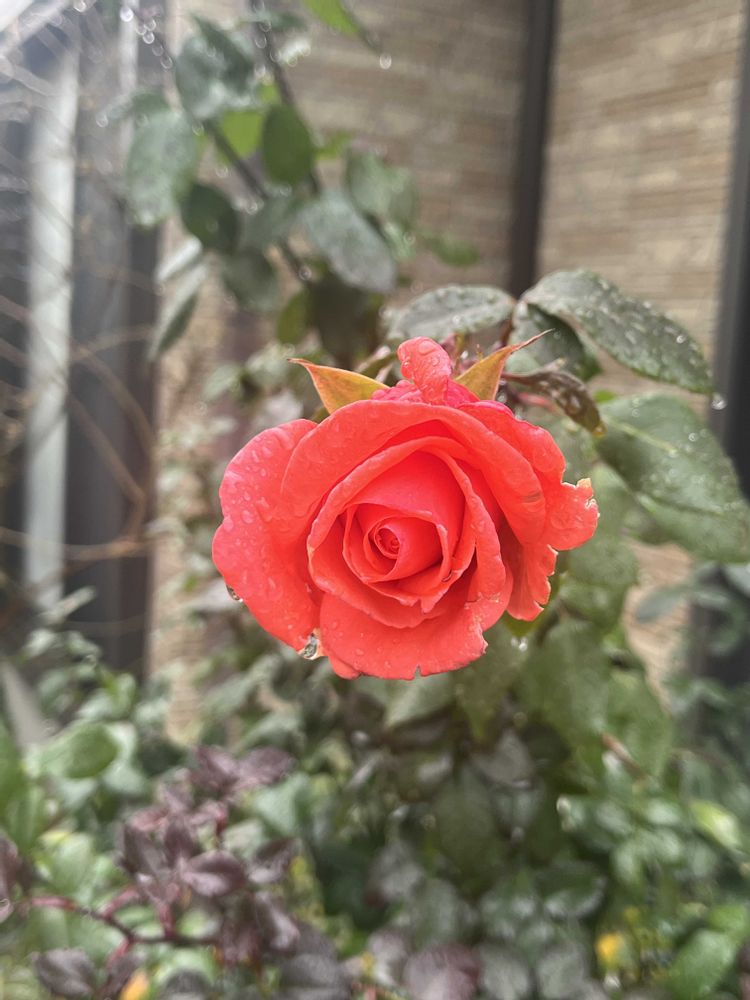 朝から雨が降っていました。そんな中、オレンジのバラが雨に濡れ、咲いています。🌹いつまでもこうして咲いてくれるので、木立のバラはなかなか剪定ができません。