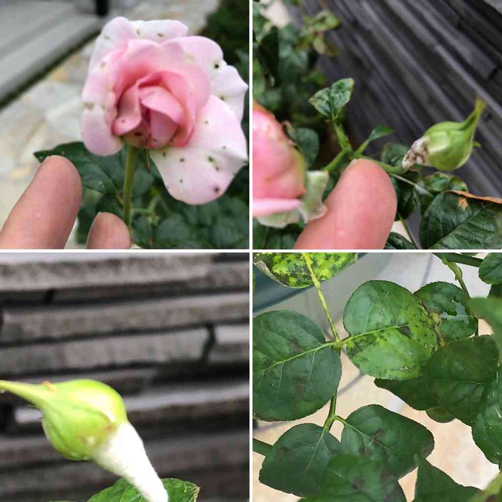 猛暑中から、黒点病の症状が葉に点在して摘み取ったり殺菌剤を噴霧したりしてましたが、今朝咲いた花を見てびっくり‼️花ビラにも黒い点々が😵