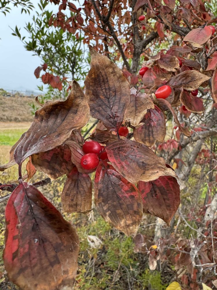 少し前までは葉っぱも真っ赤に紅葉してましたが茶色の葉っぱと赤い見も素敵でした。