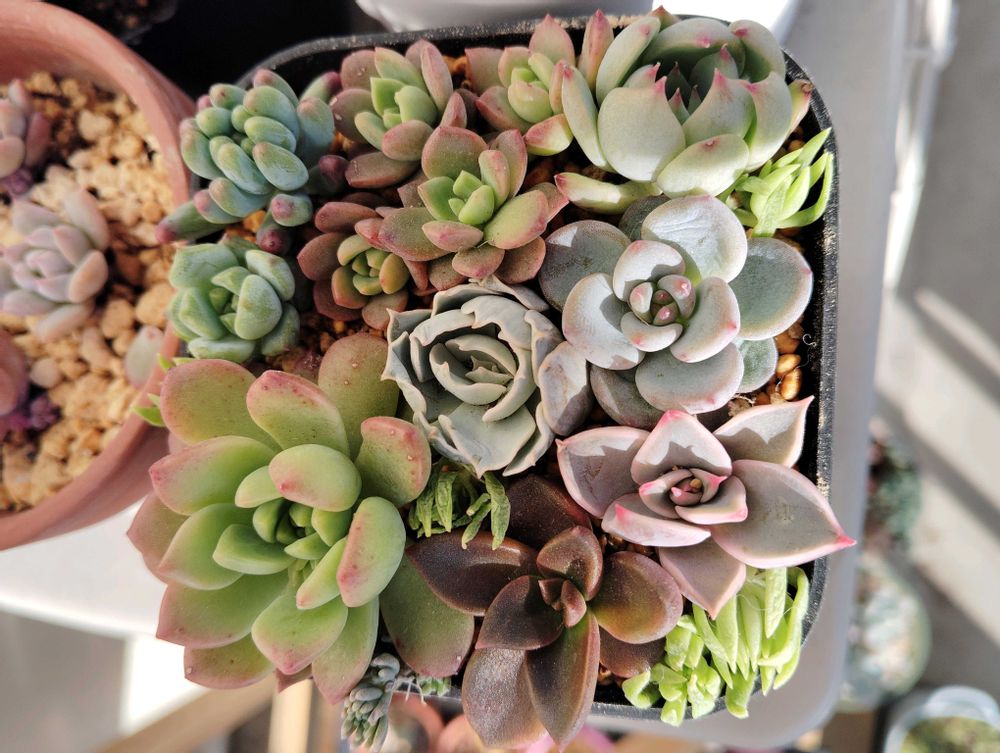 本当は種類ごとにわけて育てたいけど、今まで育ててきた子達が大きくなったり脇芽出まくりだったり、カットして増やしたい子がいたりであまり鉢数ふやせなさそうなので寄植えしてみました。寄植えなんてした事無いからただ挿しただけですが。