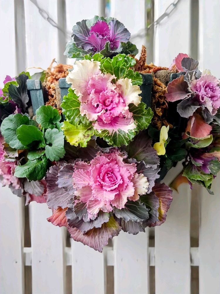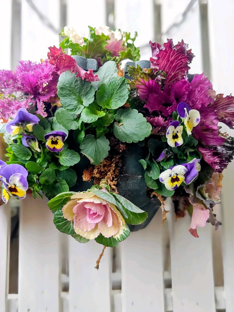葉牡丹やビオラを使って、ハンギングバスケット。種蒔きから育ちすぎた葉牡丹は、扱い難い。花数足りず、隙間多くなった。上部にあと各2ポット追加したい。