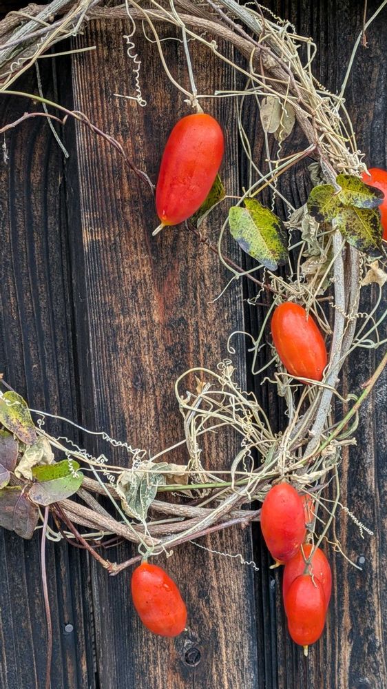 クルクルと巻いて、アケビのツルを絡めてみる🟠自然に釣り下がっていた様子には敵わないけれど、ナチュラルリース(^_-)