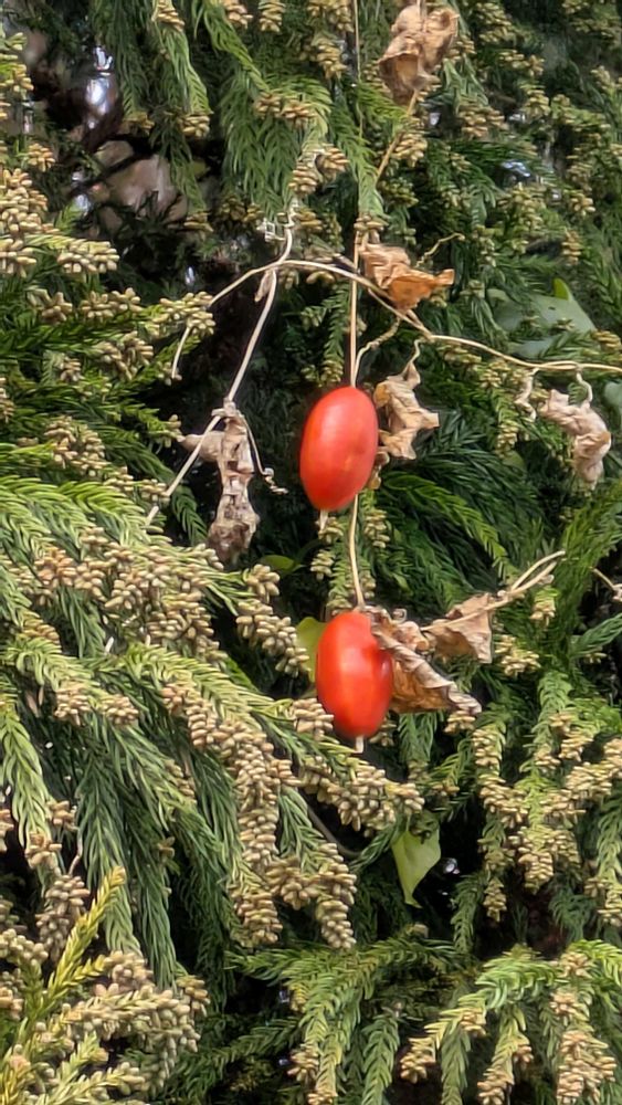 すっかり刈られたと思っていたのに、杉林の縁に実がぶら下がっていた 月曜日にビタミンカラー🏷