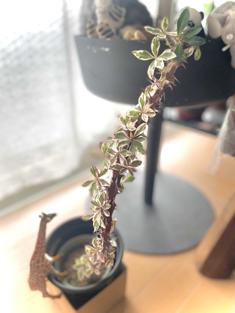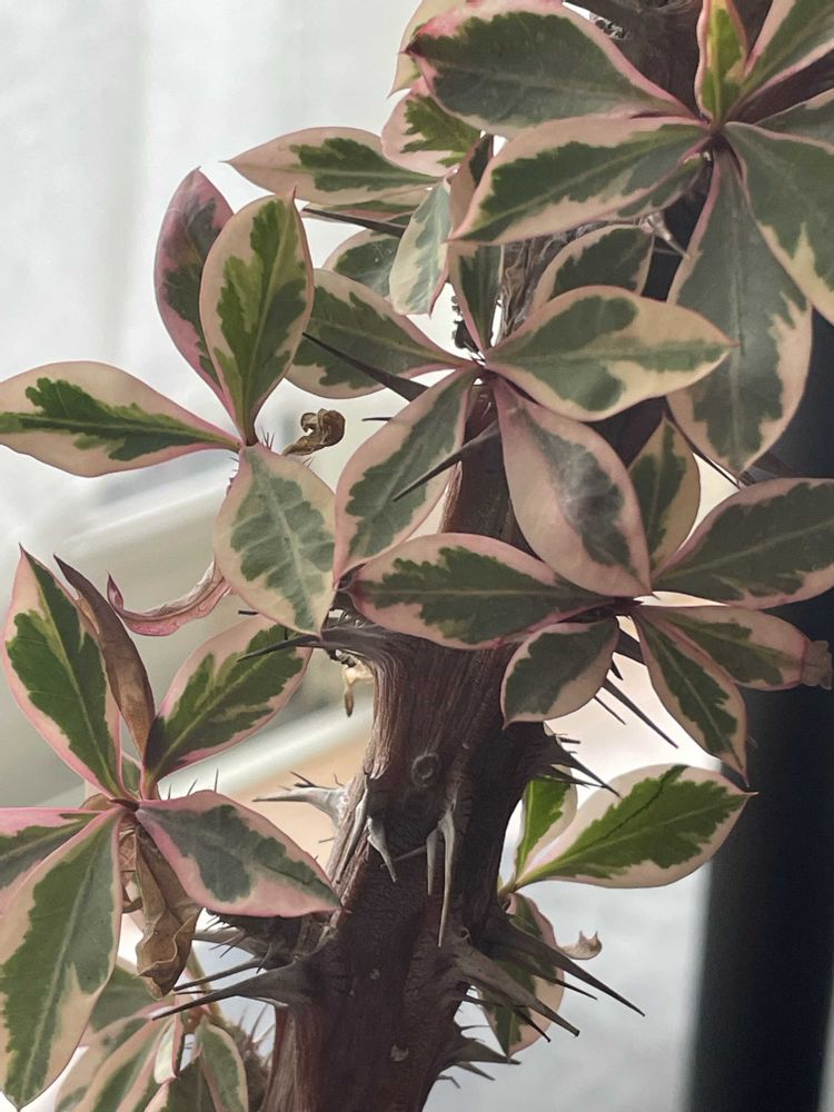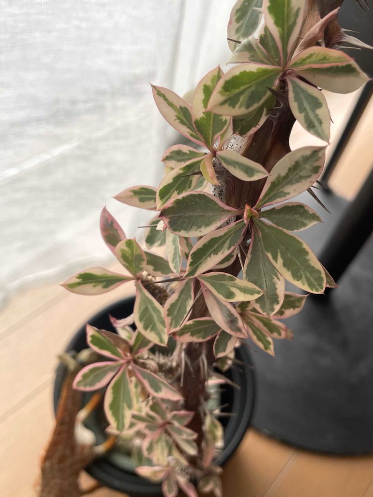 斑入りの葉っぱ綺麗。トゲトゲなのはハナキリンさんらしいね。
