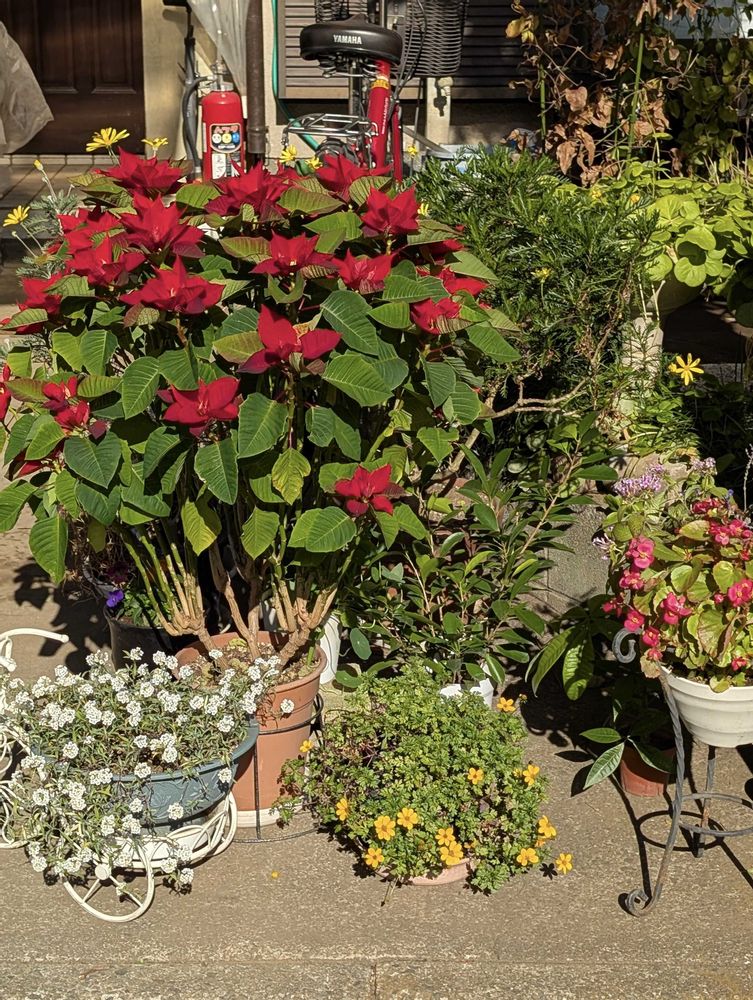 今年の春にご近所さんから「何年か前に娘からプレゼント🎁されたポインセチアですが 枯れそう(貧弱に)になったので面倒見て欲しい」と依頼されたので、剪定や植え替え・肥料などを施したら元気に育ちました👌