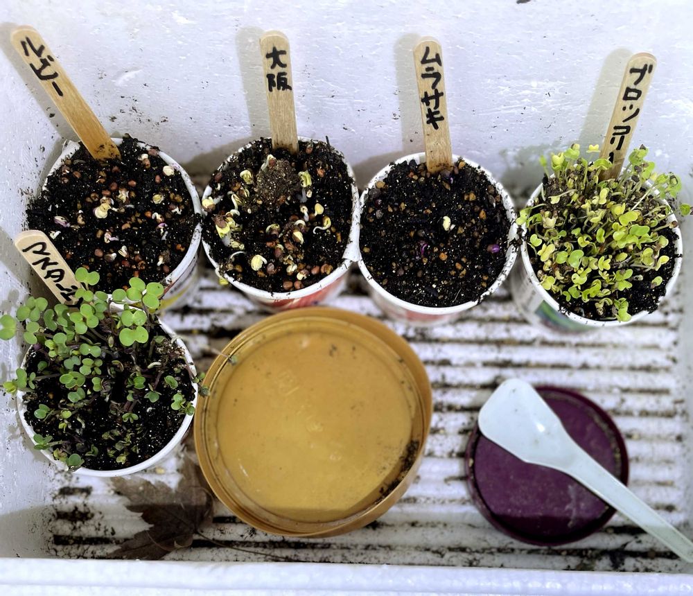 冬のスプラウト栽培。種蒔き後14日目です。ブロッコリーは早めに収穫します。