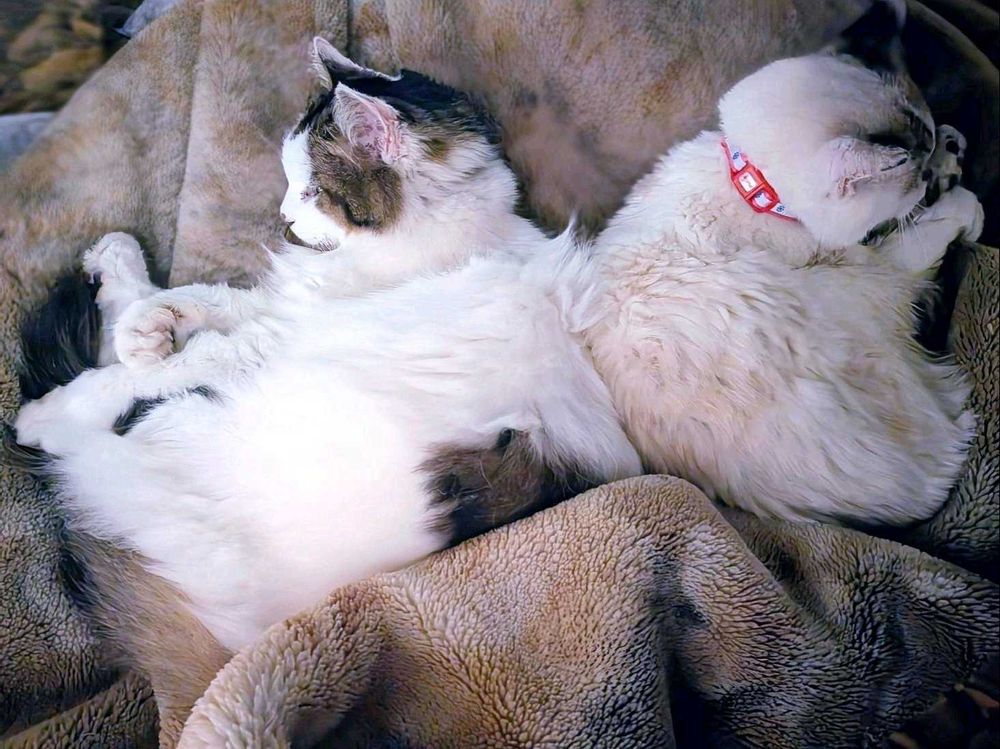 ヒネは初代の6匹一家の最後の子 チロは数年あとに他所から来たお母さんから生まれて私が幾つも作ってやった居場所で冬も暖かくしてやって 昼間は私と一緒に庭を歩いた子… チロが中に入るようになったのが遅いのでヒネにとっては驚異だったと思います その頃はタイミングによって追い駆けたり追い駆けられたり… でもそのうちお互いに慣れて激しいバトルは無くなったものの 今はチロはヒネにくっ付きたいけれどヒネがなかなか頑なでね😅💦