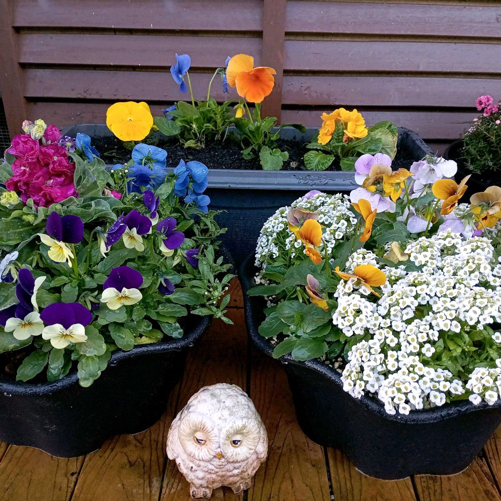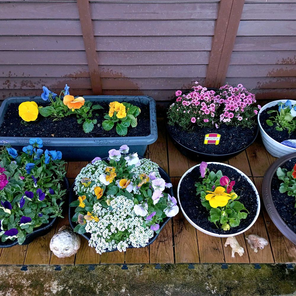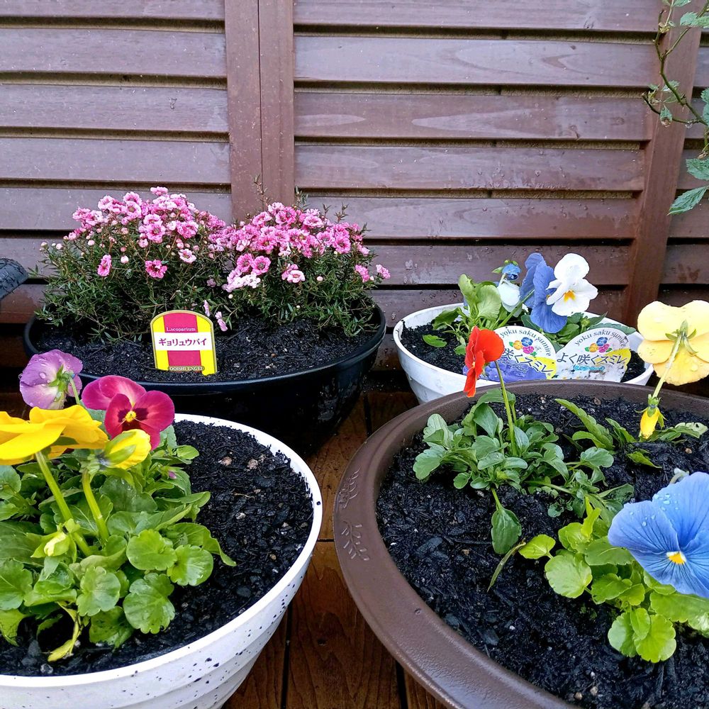 ギョリュウバイ🌼スミレ💮、バンジー…やっとこさお庭の植え替えが完了しました。
