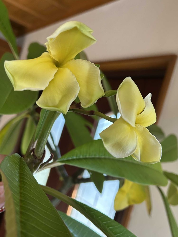 ④、花友さんに頂いて玄関に入れた所 初めて開花黄色系のプルメリア