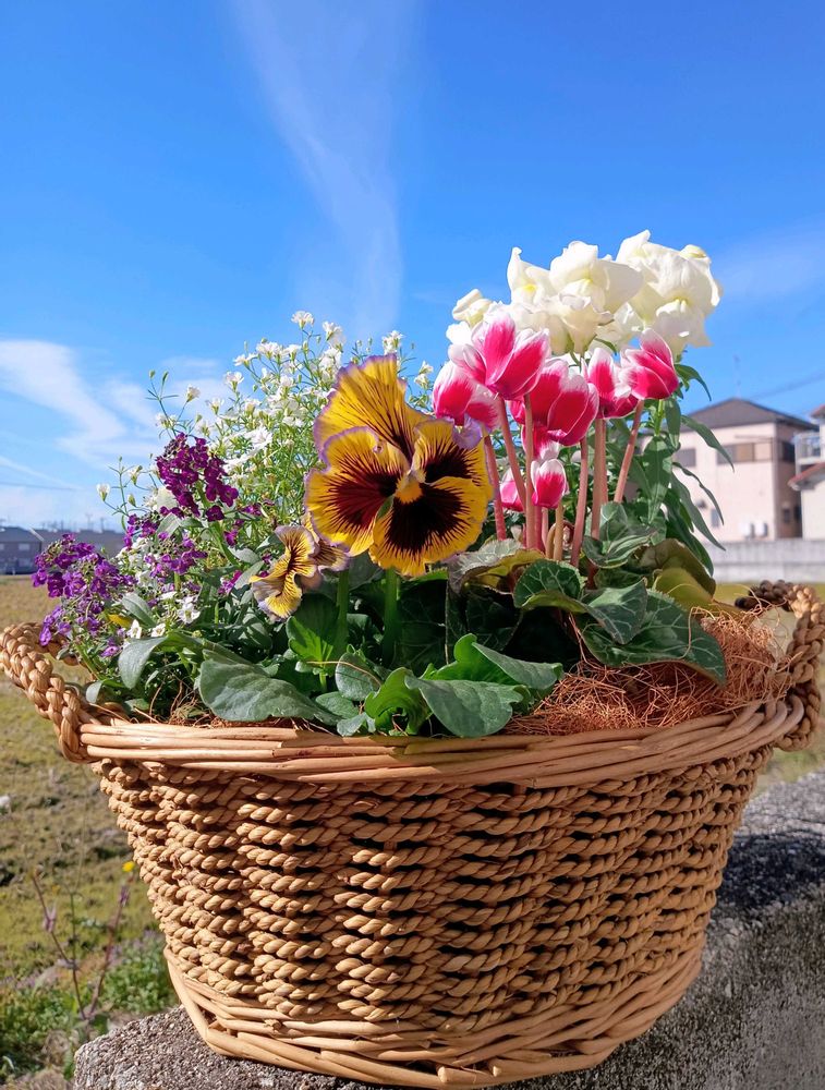 沢山の寄せ植えで籠に入れ更に豪華になりますね。