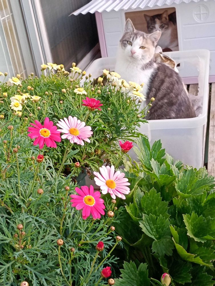 ニャンズもいて、後ろの子は三毛ちゃんかな?
