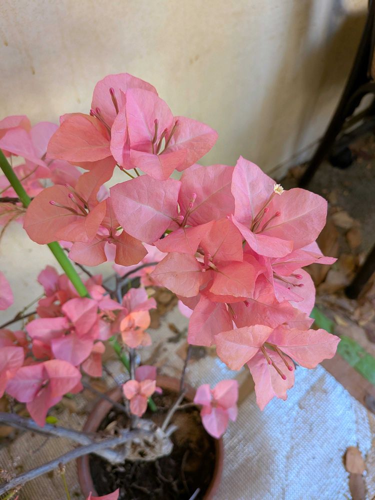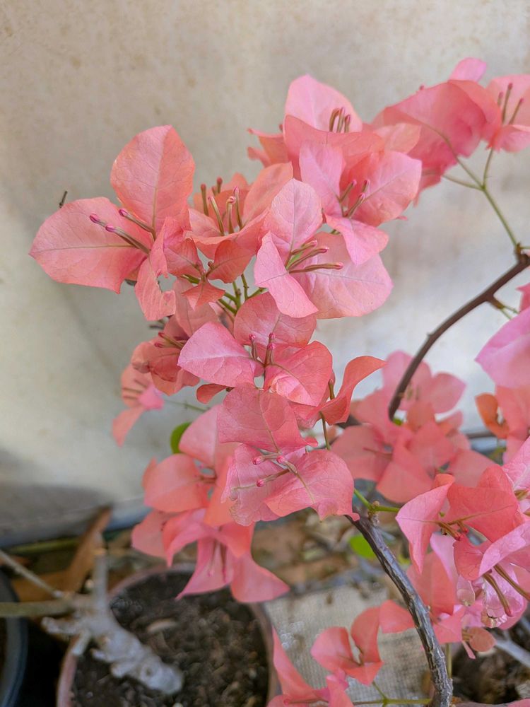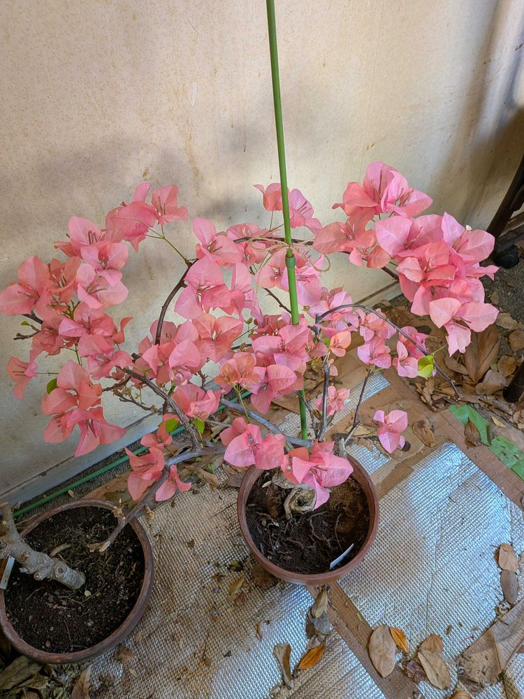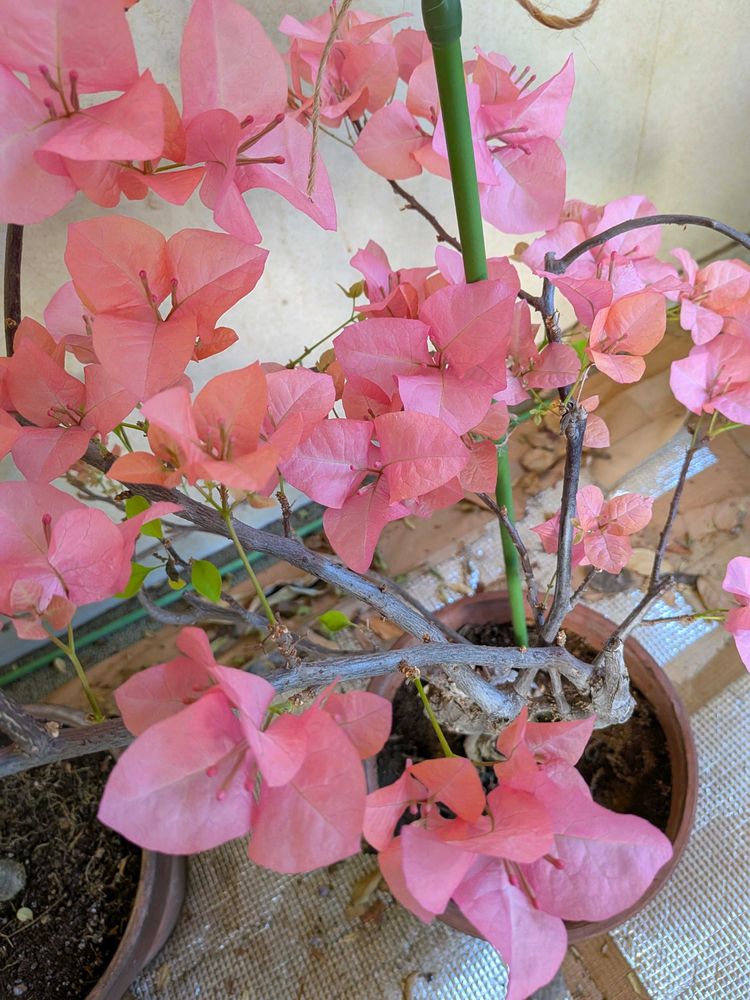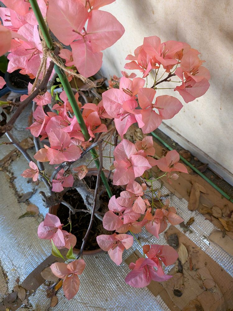 今朝はブーゲンビリアが満開になりまだ咲き続けており本来は濃いピンクですが日照不足なのか淡いピンク色になりまるで桜のようですね。そしてこちらで温室がない家庭は屋内に取り込んでも休眠状態だと思いますが、気温を保っている我が家では冬に始めて満開になり早く春が来たようで嬉しく思いました!