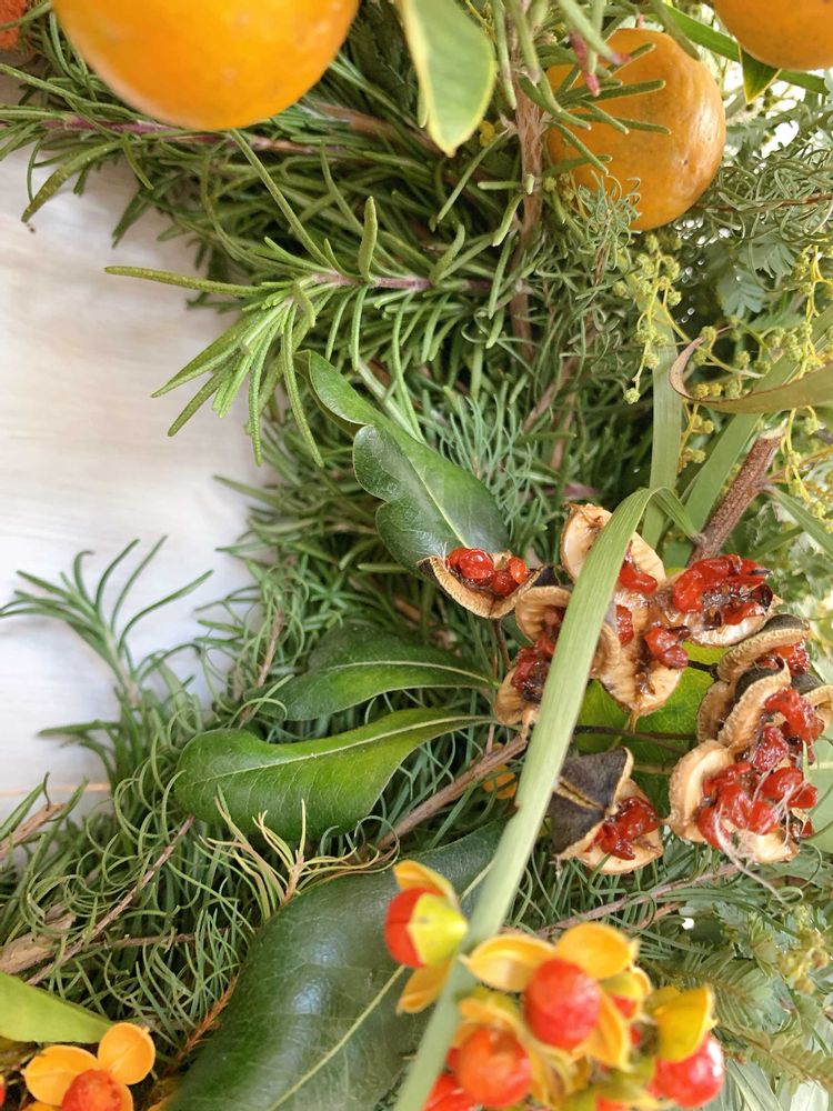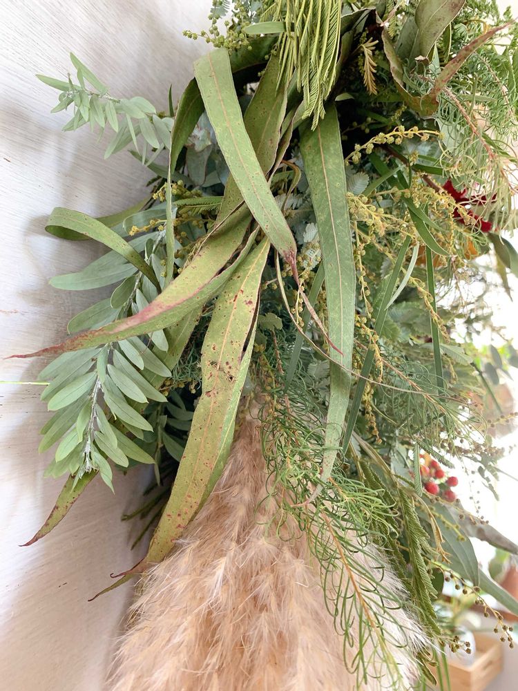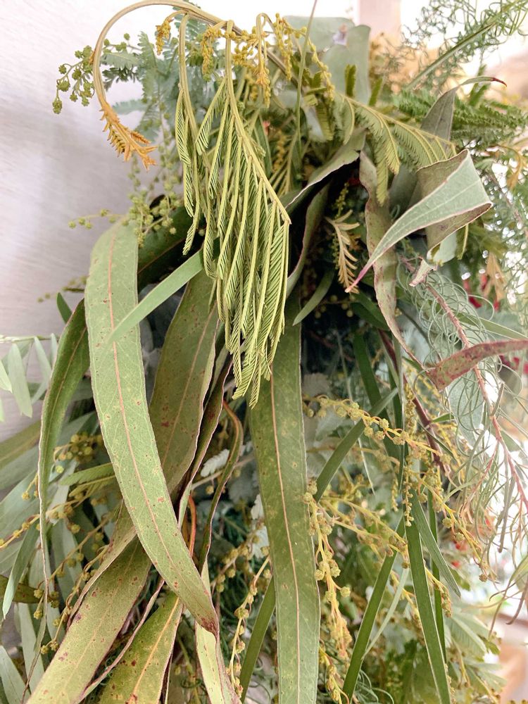 ローズマリーで土台を作り、ティーツリー、ミモザ、ユーカリ、ヒバなどをせっせと差し込みました。