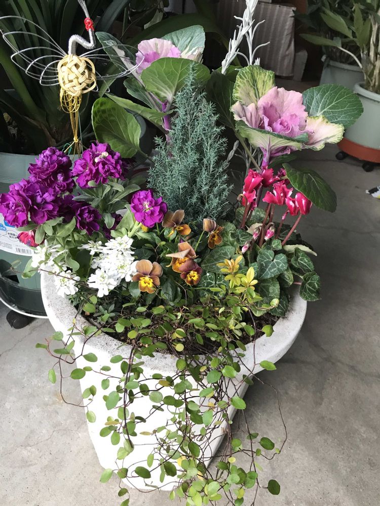 お正月🎍飾り、葉牡丹、八重咲きストック、ビオラ、シルバースター、プリムローズジャスミン、エレモフィラホイップクリーム、ワイヤーフランツなど植え込みました