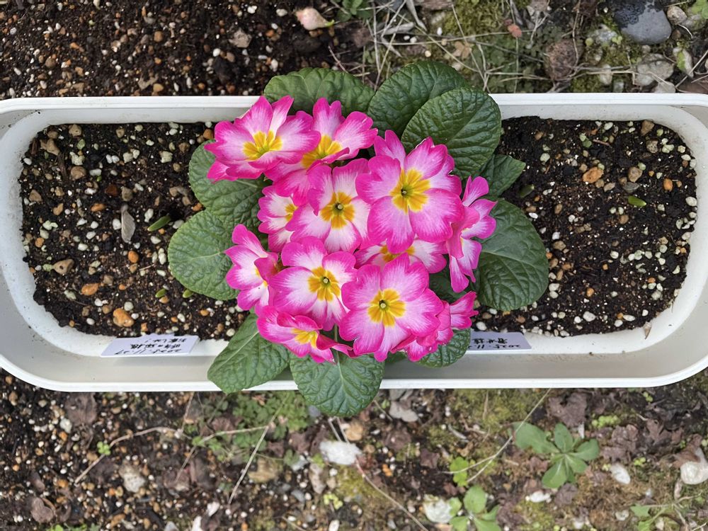 ③ 華やかに咲くプリムラジュリアン🌸 両脇に植えた球根から 少し芽が見えてきてます╰(*´︶`*)╯