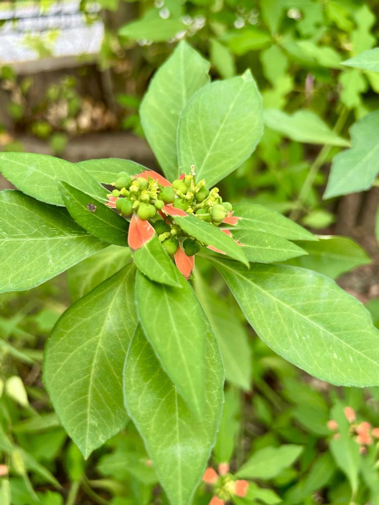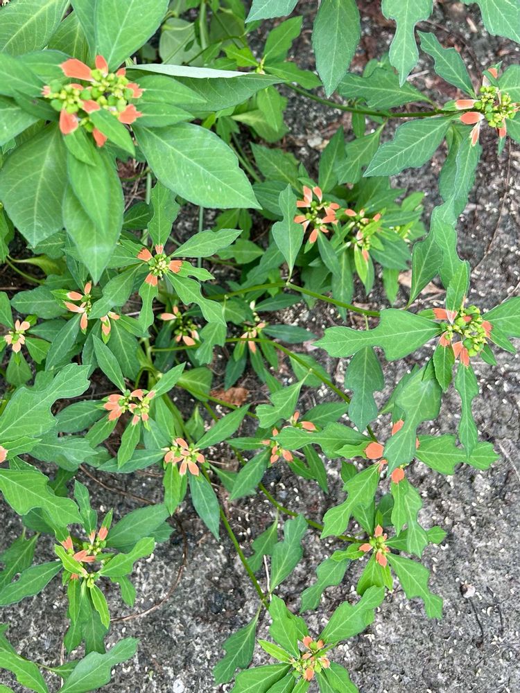 になんだか似ているショウジョウソウ。赤くなりかけてる葉っぱとかバイオリン型に🎻ギザギザしている葉っぱの質感とか。花なのか実なのかなプツプツとか。あら別名サマーポインセチアっていうんだ。近所の空き家の玄関先に茂った雑草です。10月04日📸武蔵野市西久保付近