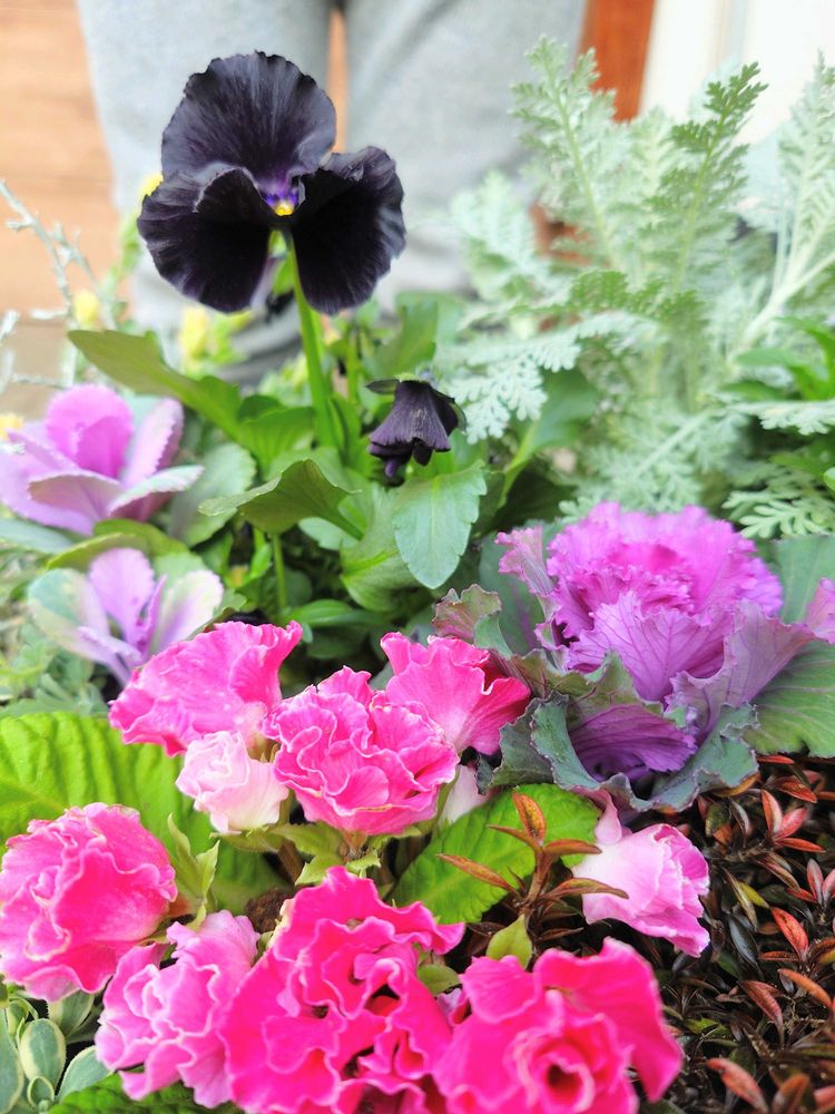 プリムラ、葉牡丹、ビオラとオーソドックスな花苗たちで寄植えです♪