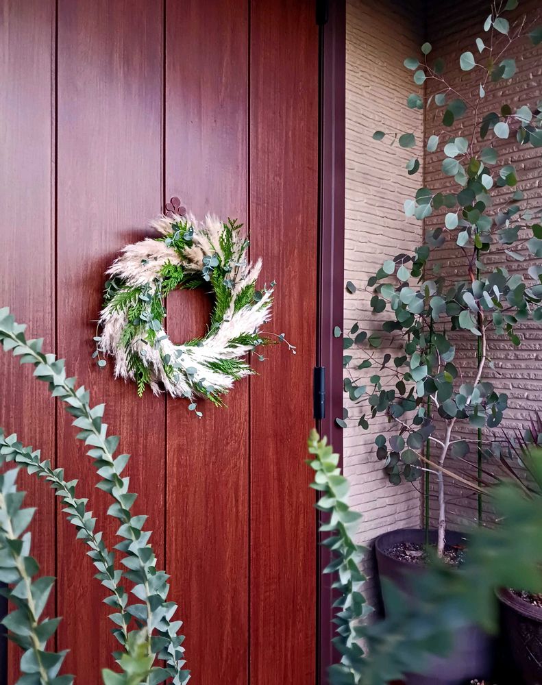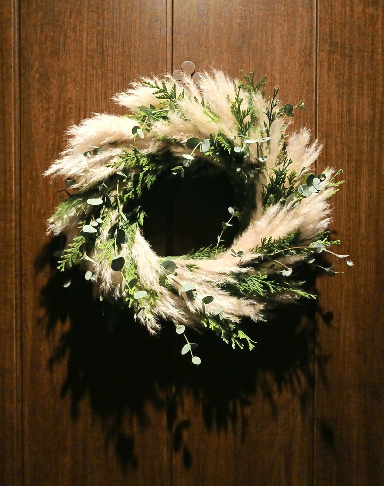 赤い実もコニファーも手に入らず、お正月生け花用のヒバだけ求めて、秋に作ったパンパスグラスリースを解体してグリーン×ホワイトリースにリメイクしました。