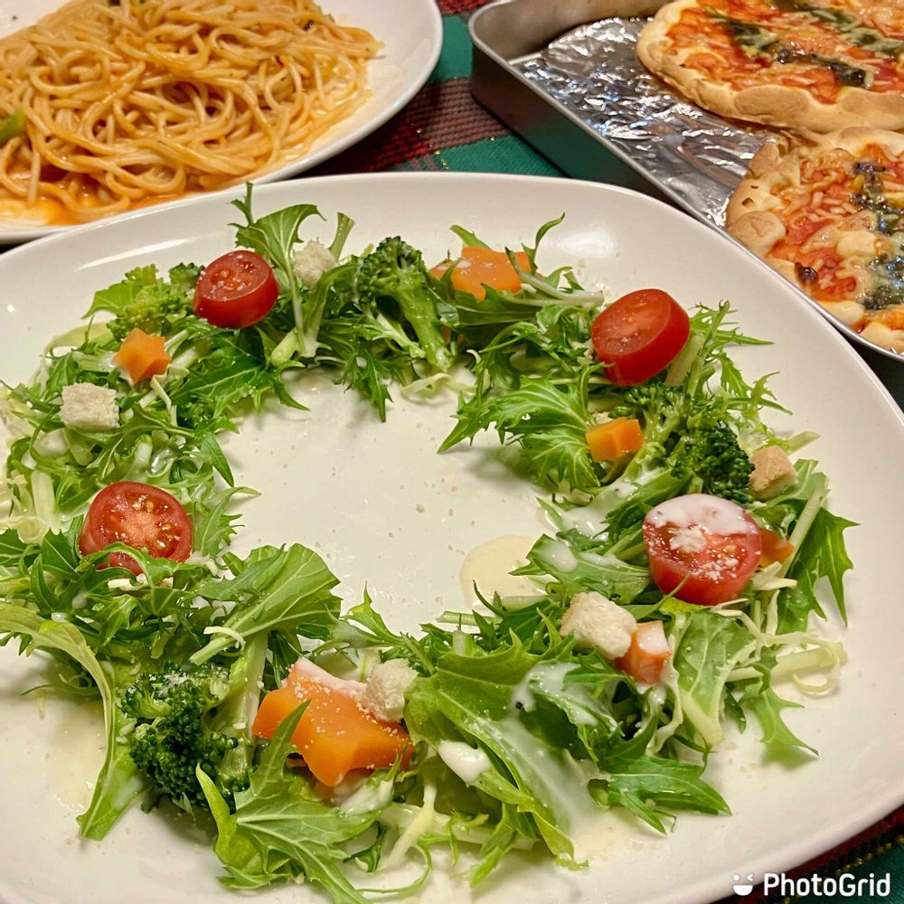 ディナー🍽️は、お義父母さんからいただいた水菜やブロッコリー🥦のリースサラダ🥗、パスタ🍝やピザ🍕、チキン🍗やケーキ🍰など🤤。