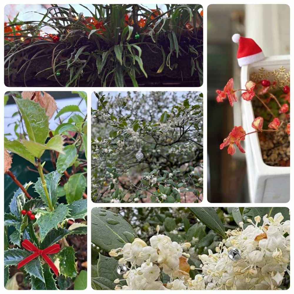 左下のリボンが写ってる画像はベランダの斑入り柊木モクセイの小さな苗