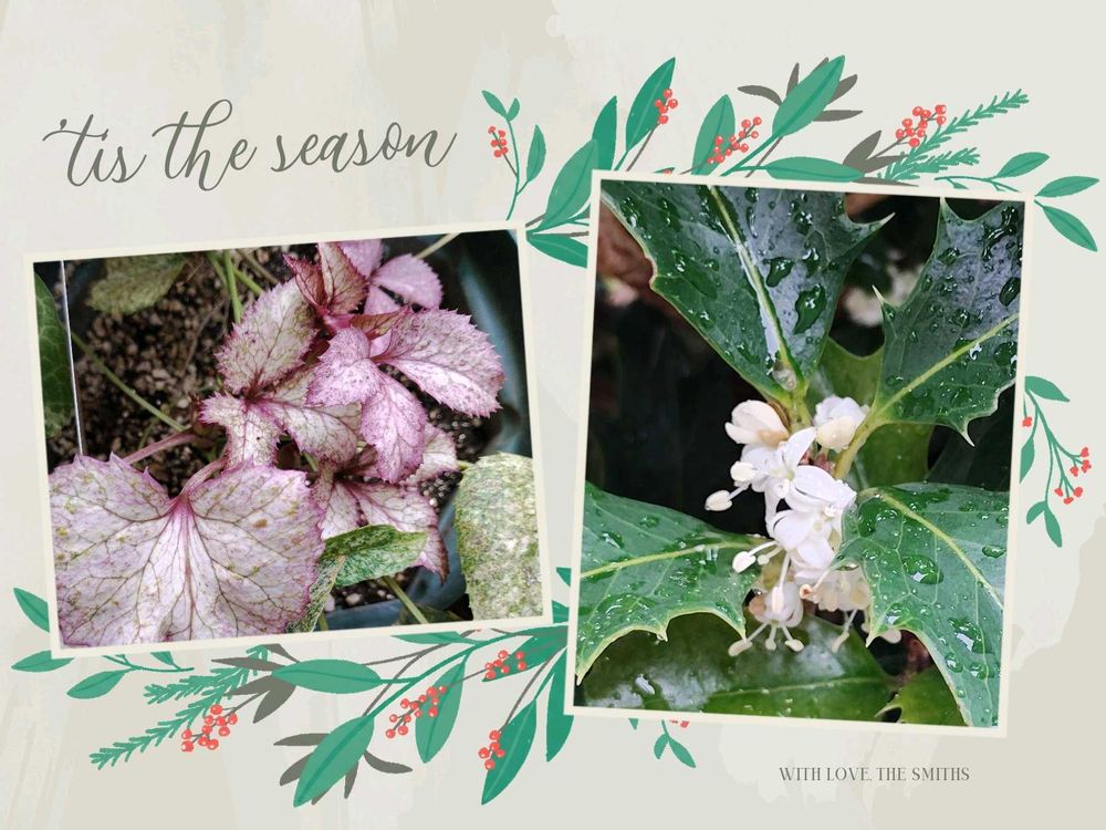 クリスマスにちなんで、クリスマスローズ ステルニー‘オーロラ’(左)とヒイラギ(右)