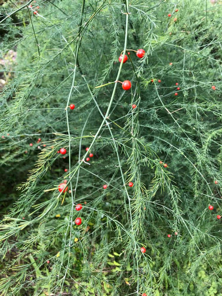 長野では、道端にアスパラが勝手に生えているのはよくあること。多分この実を鳥が食べて、フンからのこぼれ種が発芽したもの。うちの庭にも2ヶ所生えてる。