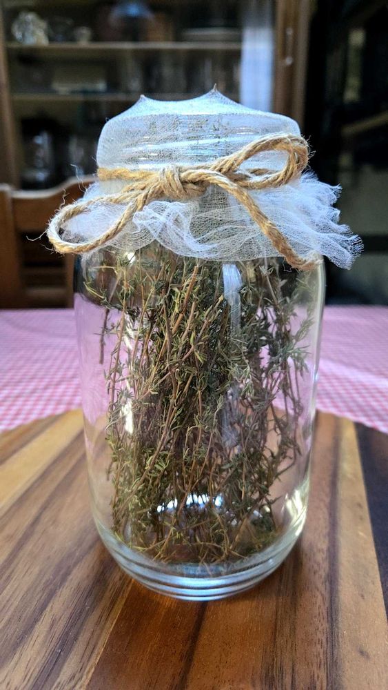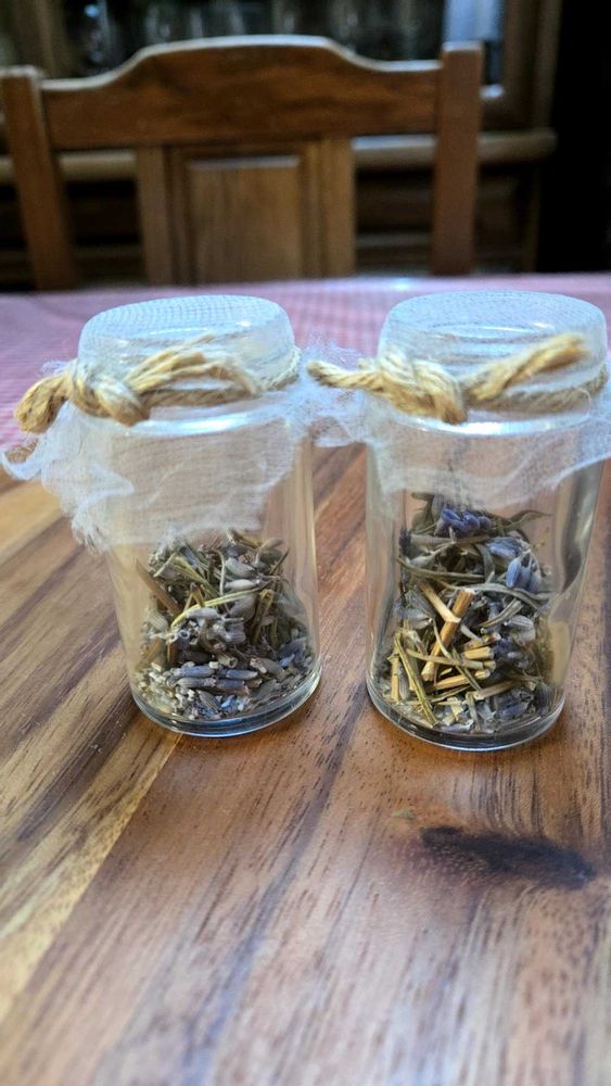 6月のハーブボランティアで頂いたラベンダー①と、7月に頂いたタイム③をそれぞれドライにしたものを、瓶に詰めてネットをかけて麻の紐で結んでみました②④✨