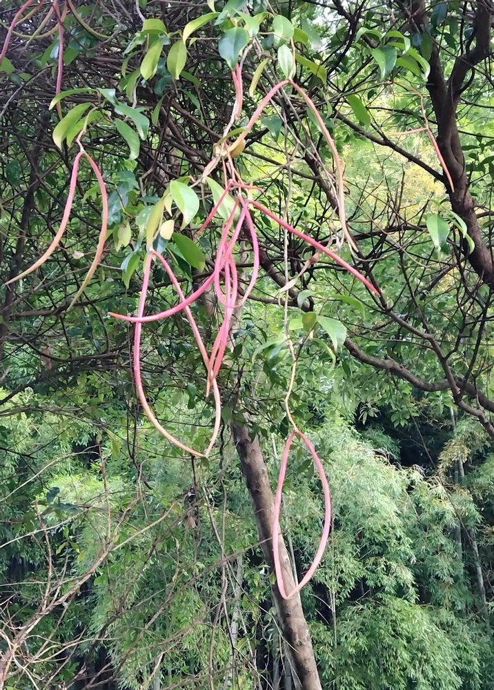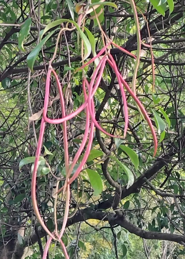細長い紅褐色の鞘が幾つもぶら下がり