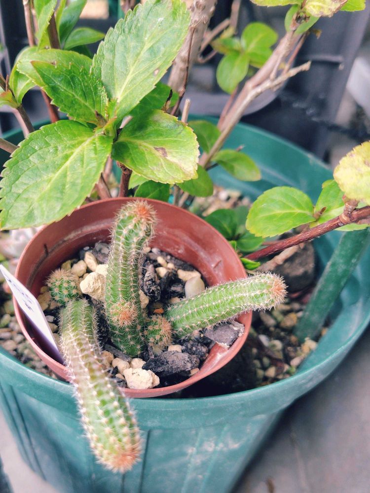 ヒモサボテンの花を咲かせるには、冷気にさらした方が良いと噂なので、小鉢1個、アジサイの足元に忍ばせて軒下に配置。(1枚目)