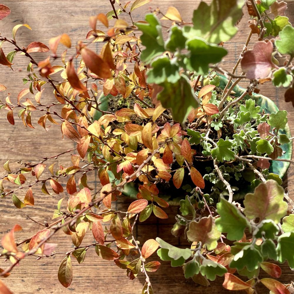 雪柳と小菊の寄せ植えです。雪柳はこの秋最後の紅葉です。小菊は蕾はあるのですがなかなか咲きません。