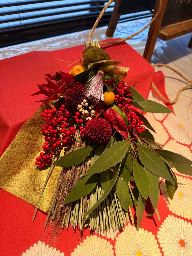 お正月の玄関飾りと、生花のアレンジを作りました。