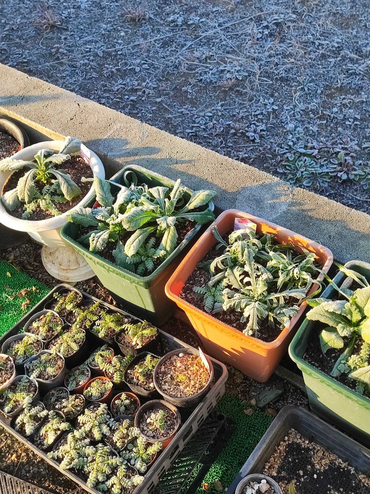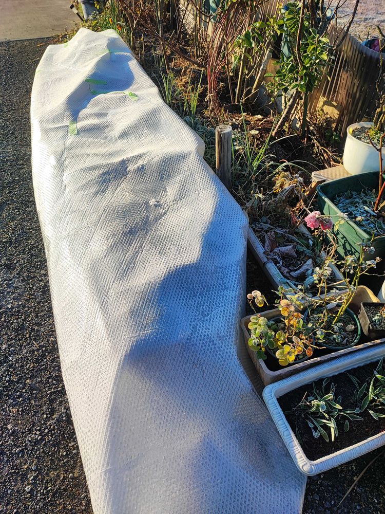 外は霜で銀世界()です。霜よけとかハウスとかに入れた方々は、霜こそ降りてはいないけど土は凍ってます…毎年のことだし去年よりは手厚い保護をしているのだけど、大丈夫かしらと心配にはなりますよね。むーん。