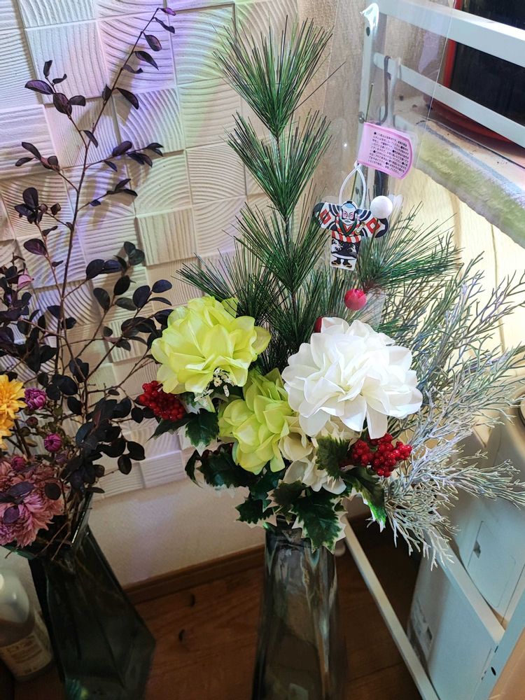 昨日?クリスマスのツリーとかを片付けたので、玄関のお花(造花)も迎春仕様にチェンジしました。買っておいた造花をバランス取って纏めて保管していたので、飾っていたクリスマス用の造花の中央に、纏めておいた束のままINして整えて完成~。5秒で完成しました。造花もたくさん買うと高くなるので、セリアで選んでる時にクリスマスの造花は正月にも使い回すつもりで、雰囲気が合うのを一緒に買っていたのでボリュームも出て良きです。
