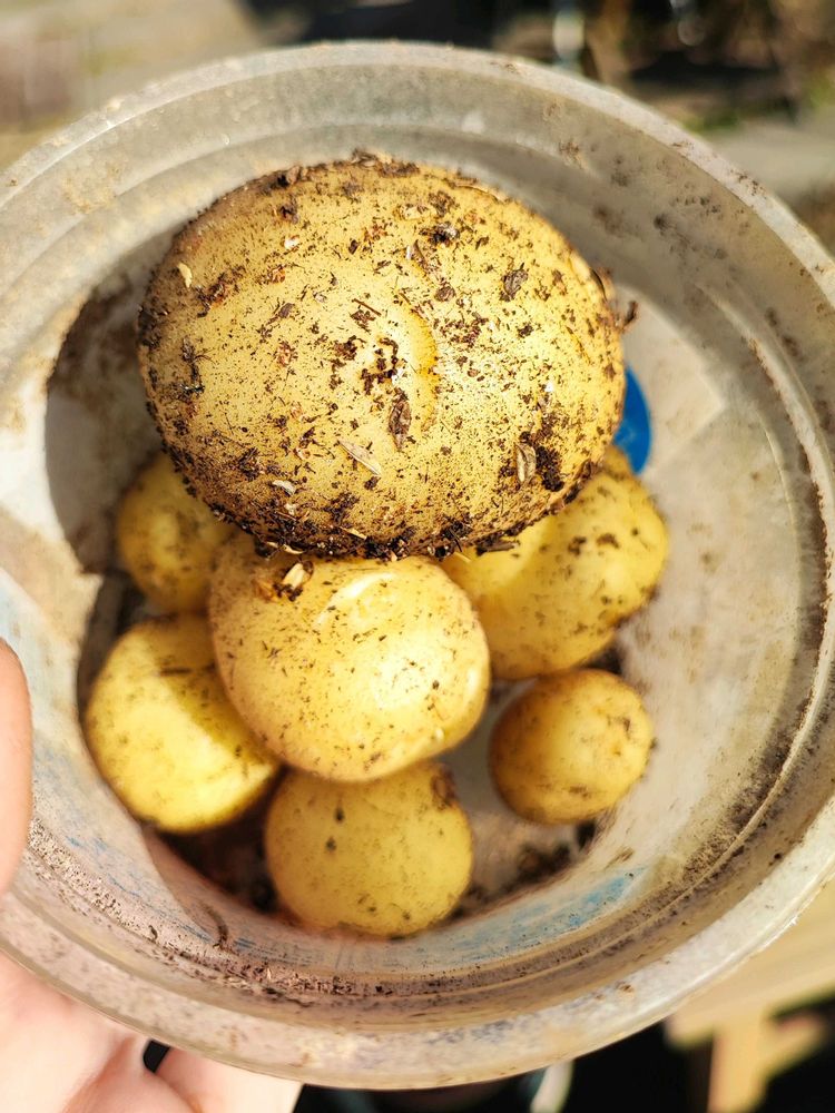 春にジャガイモを収穫した時に出た豆芋を保管しておいて、9月ごろ自然に芽が出たところで鉢植えに植えて育てたジャガイモ、ハウスの中でなんとか耐えてましたがここ数日の冷え込みでいよいよ枯れたのでポットごとひっくり返して収穫。数は少ないですが、キレイでいい芋が出来てました✨ 春の反省を活かしてきれいな土で育てたので春ジャガよりも肌がキレイで文句なしです。芽が出た豆芋を3号ポットくらいのビニールポットに植え、元肥をガッツリ入れて自然に育ったら、大きい芋は8号鉢、小さいものは4号ロングとか5号の黒ビニールポットに鉢増ししてその時に1回だけ土寄せしてあとは収穫まで水やりのみでした。